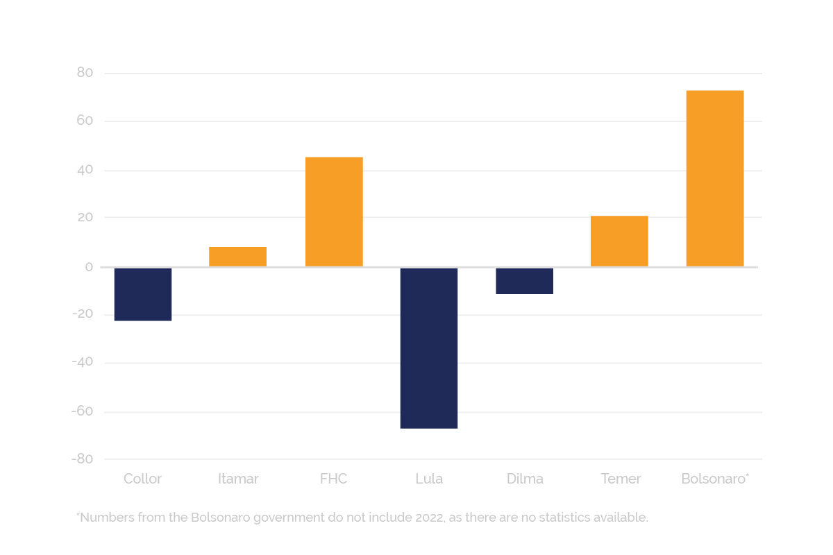 In the first year of the Bolsonaro government, 2019, the deforested area jumped to 10,100 km². Rates continued to rise in 2020 (10.8 thousand km²) and in 2021 (13 thousand km²). The data for 2022 are not yet available. Deforestation rate rose 73% in the first three years of Bolsonaro's administration.