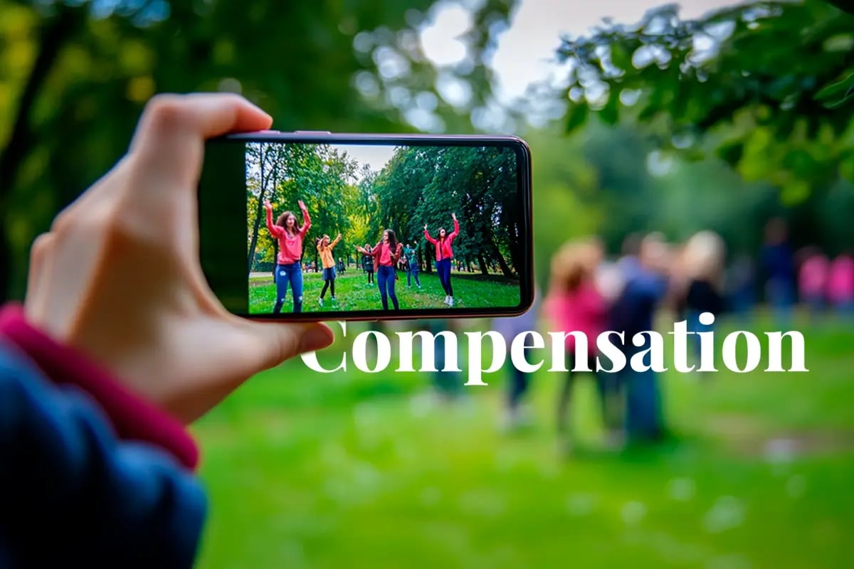 Close-up of a person editing a TikTok video of a group of teenagers dancing in a park. AI generated picture.