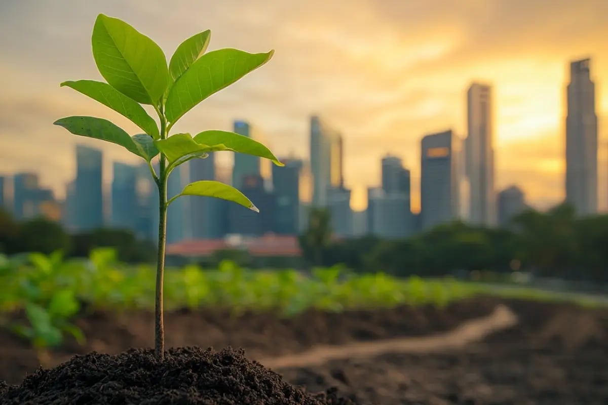 Close-up van een groene loofboomzaailing tegen de skyline van Singapore. AI-gegenereerde afbeelding.