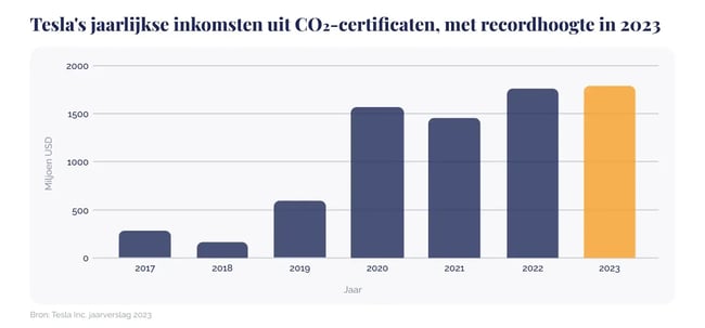 Grafiek met Tesla's jaarlijkse inkomsten uit CO₂-certificaten.