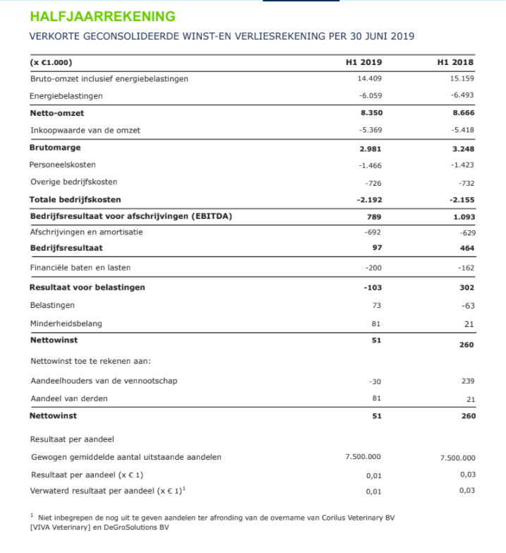 In het eerste halfjaar van 2019 heeft de vennootschap een bedrijfsresultaat voor afschrijvingen (EBITDA) behaald van € 0,8 miljoen positief en een nettowinst van € 0,1 miljoen positief. Voor heel 2019 blijft het bestuur vasthouden aan de eerder afgegeven EBITDA financiële prognose van € 1,5 miljoen positief.